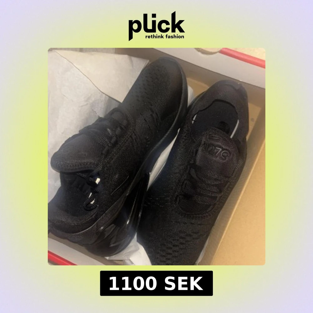 Helt nya/oanvända Nike Air Max 270 Triple Black sneakers med en clean helsvart look. Ovandel i mesh och syntet, stor synlig Air-enhet i hälen och diskret Nike-logga på sidan. Skorna har snörning och en sportig vibe som passar perfekt till streetwear.