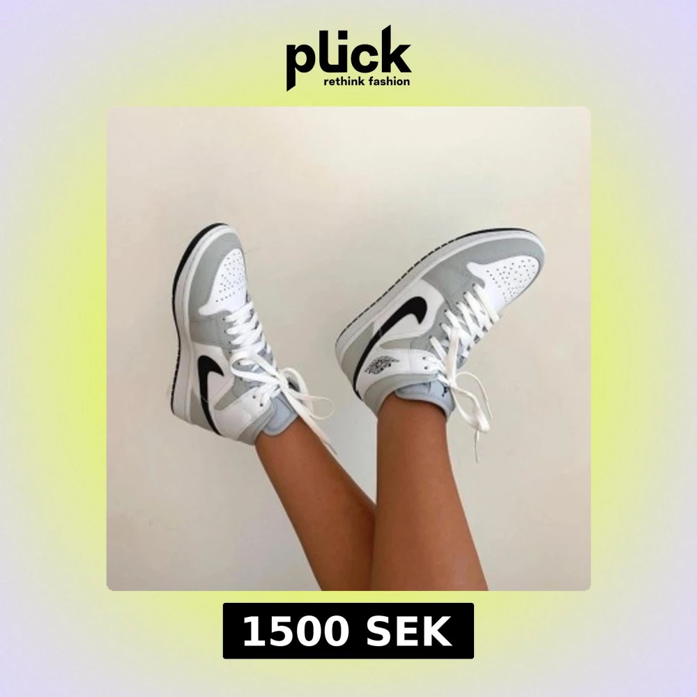 Säljer ett par Nike Air Jordan 1 Mid i vitt och ljusgrått med svart swoosh, för kvinnor. Skorna har medelhögt skaft, klassisk snörning och perforerad tå. Ikonisk Air Jordan-logga på sidan och svart yttersula. Perfekta för dig som gillar stilrena sneakers.