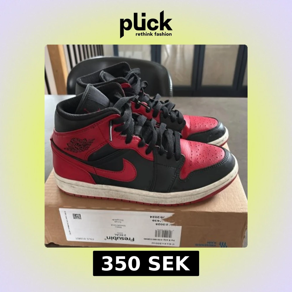 Säljer ett par Nike Air Jordan 1 Mid i klassisk svart och röd färgkombination. Skorna har svart bas med röda detaljer, vit mellansula och röd yttersula. Ikonisk Air Jordan-logga på sidan och svart snörning. Perfekta för dig som gillar streetwear och sneakers.