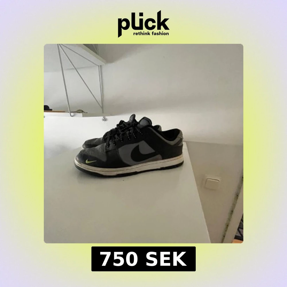 Nike Dunk SB sneakers i svart och grå med neongula detaljer och logga. Skorna har lågt skaft, snörning med svarta och vita skosnören samt en vit sula. Ovandelen är i mocka och syntet, med klassisk Nike Swoosh på sidan och broderad logga bak.