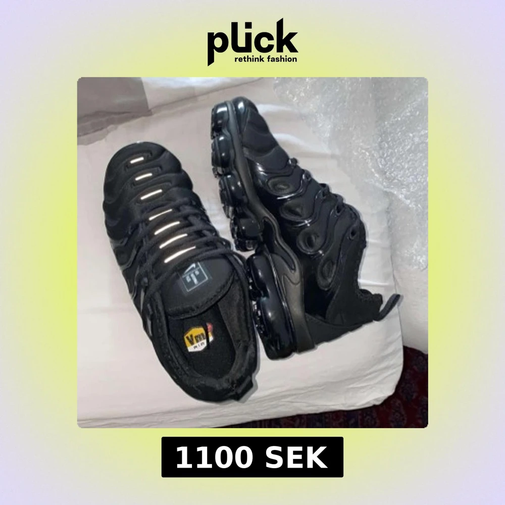 Säljer ett par helsvarta Nike Air Vapormax Plus sneakers med futuristisk design och synliga luftbubblor i sulan. Skorna har snörning och en glansig ovandel i syntetmaterial. Perfekta för dig som gillar streetwear och sportig stil.