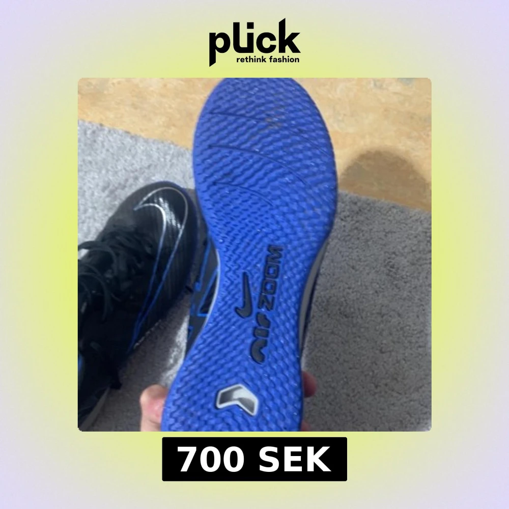 Säljer ett par Nike Mercurial Zoom fotbollsskor i svart med blå och silverdetaljer. Skorna har snörning, platt sula och är tillverkade i syntetmaterial. Perfekta för inomhusfotboll med sin greppvänliga blå sula och sportig design