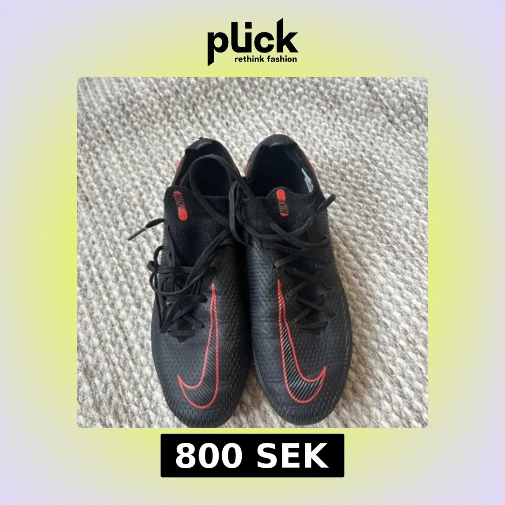 Säljer ett par Nike Phantom GT2 fotbollsskor i svart med röda detaljer och Nike-logga. Skorna har snörning, rund tå och platt sula med dobbar för bra grepp på planen. Ovandelen är i syntetmaterial med textur för bättre bollkontroll. Perfekta för dig som vill sticka ut på fotbollsplanen.