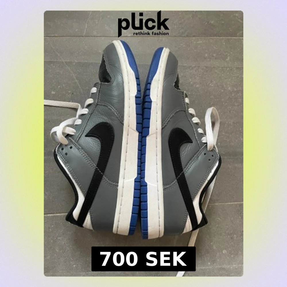 Säljer ett par Nike Dunk Low By You, egendesignade via Nike. Unik färgkombination som inte finns i butik, perfekt om du vill ha något som sticker ut. Skorna är i mycket fint skick, sparsamt använda och väl omhändertagna. Rent läder, fina sulor och inget kraftigt slitage. Detaljer: • Storlek: EU 40 • Modell: Nike Dunk Low • Version: Nike By You / custom • Skick: Mycket fint • Färg: Grå/svart med blå sula Nypris låg runt 1500 kr.