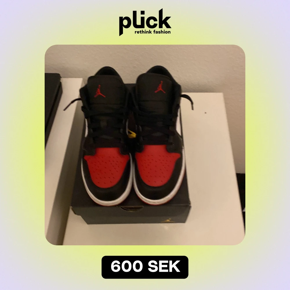 Snygga Nike Air Jordans i klassisk svart, röd och vit färgkombination. Skorna har en ikonisk design med snörning och den välkända Jumpman-loggan på plösen. Perfekta för sneaker-entusiaster. Köpt för 1300