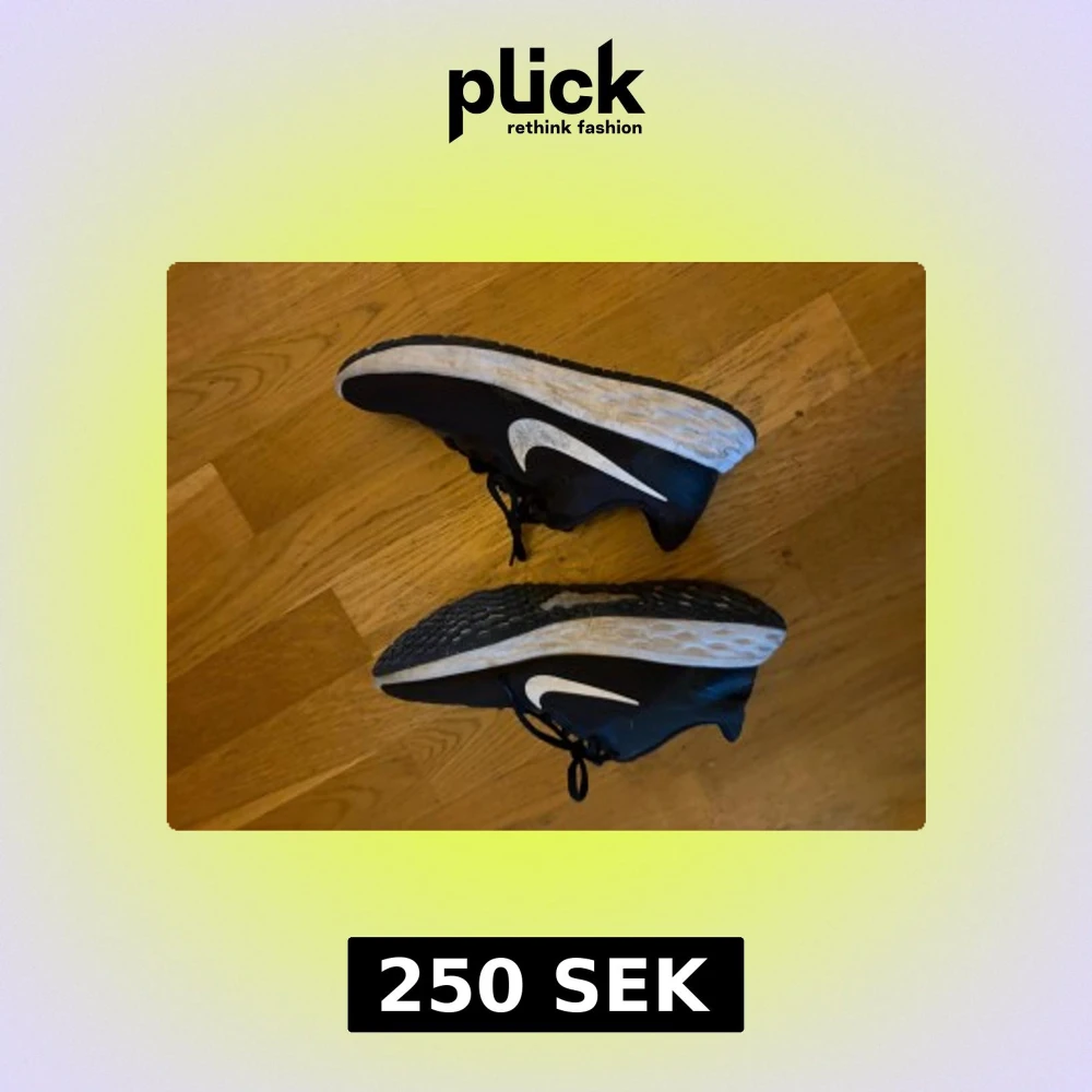 Svarta Nike sneakers med vit swoosh och vit, mönstrad mellansula. Skorna har snörning och platt sula med greppvänligt mönster undertill. Ovandelen är i syntetmaterial och designen är sportig och clean, perfekt för dig som gillar att sticka ut på löprundan.