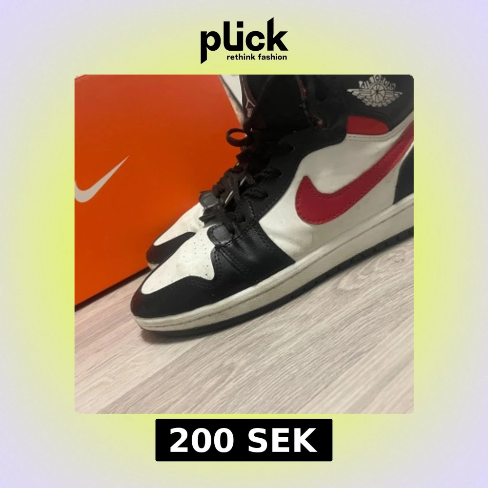 Snygga Nike Air Jordan 1 sneakers i svart, vitt och rött med klassisk röd swoosh. Högt skaft, svart snörning och ikonisk Air Jordan-logga på sidan. Skorna är i skinn och har en platt sula. Perfekta för dig som gillar streetstyle och vill sticka ut.
