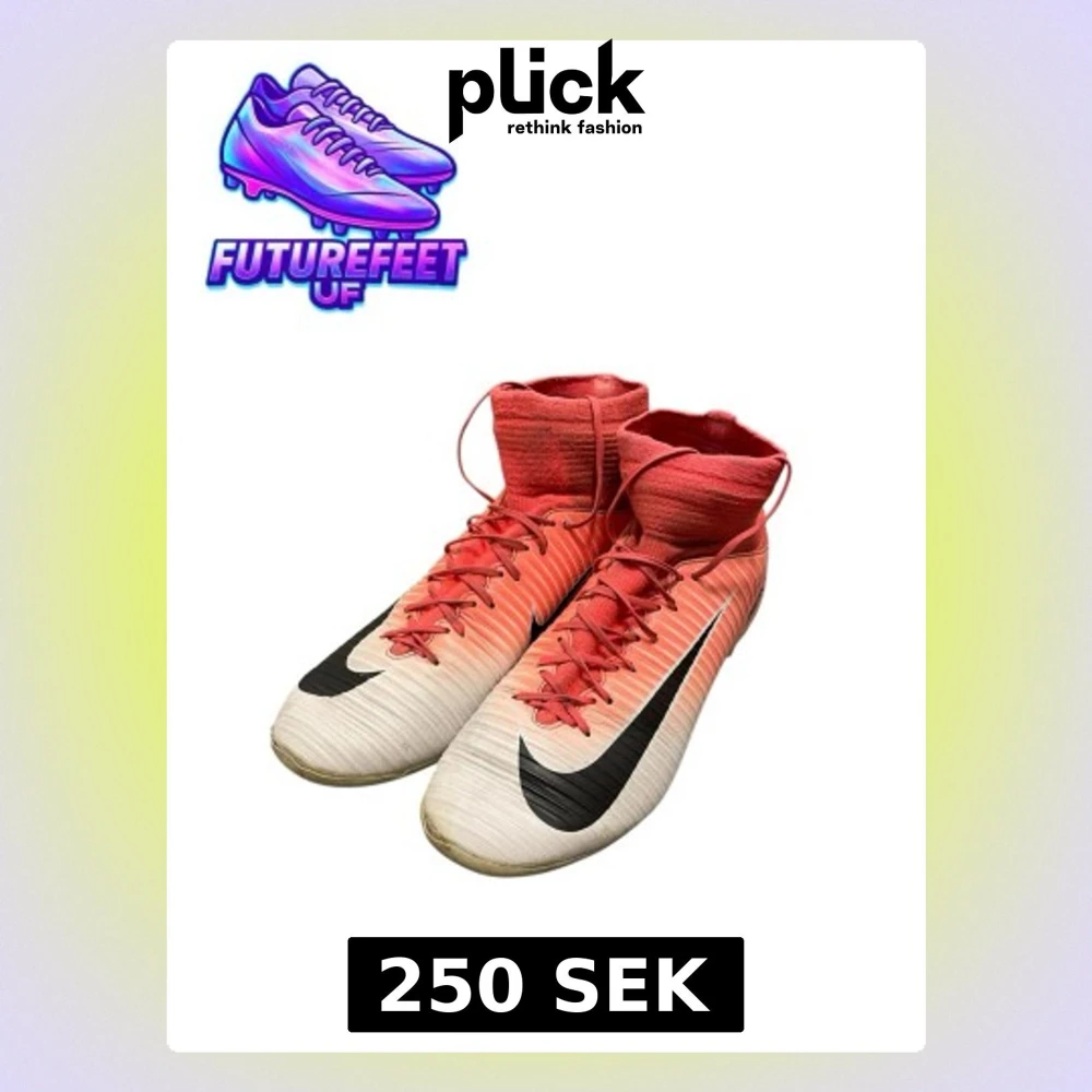 Nike Mercurial fotbollsskor med högt skaft i röd och vit färg, med svart swoosh på sidan. Skorna har snörning och platt sula med dobbar för gräsplan. Tillverkade i syntetmaterial och har en smal, sportig form som ger bra grepp och kontroll på planen.