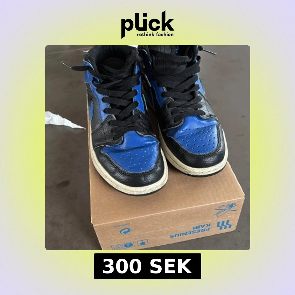 Säljer ett par Nike Air Jordans i svart och blått skinn med klassisk design och vit platt sula. Skorna har snörning och rund tå, perfekt för dig som gillar streetwear och sneakers med ikonisk look.