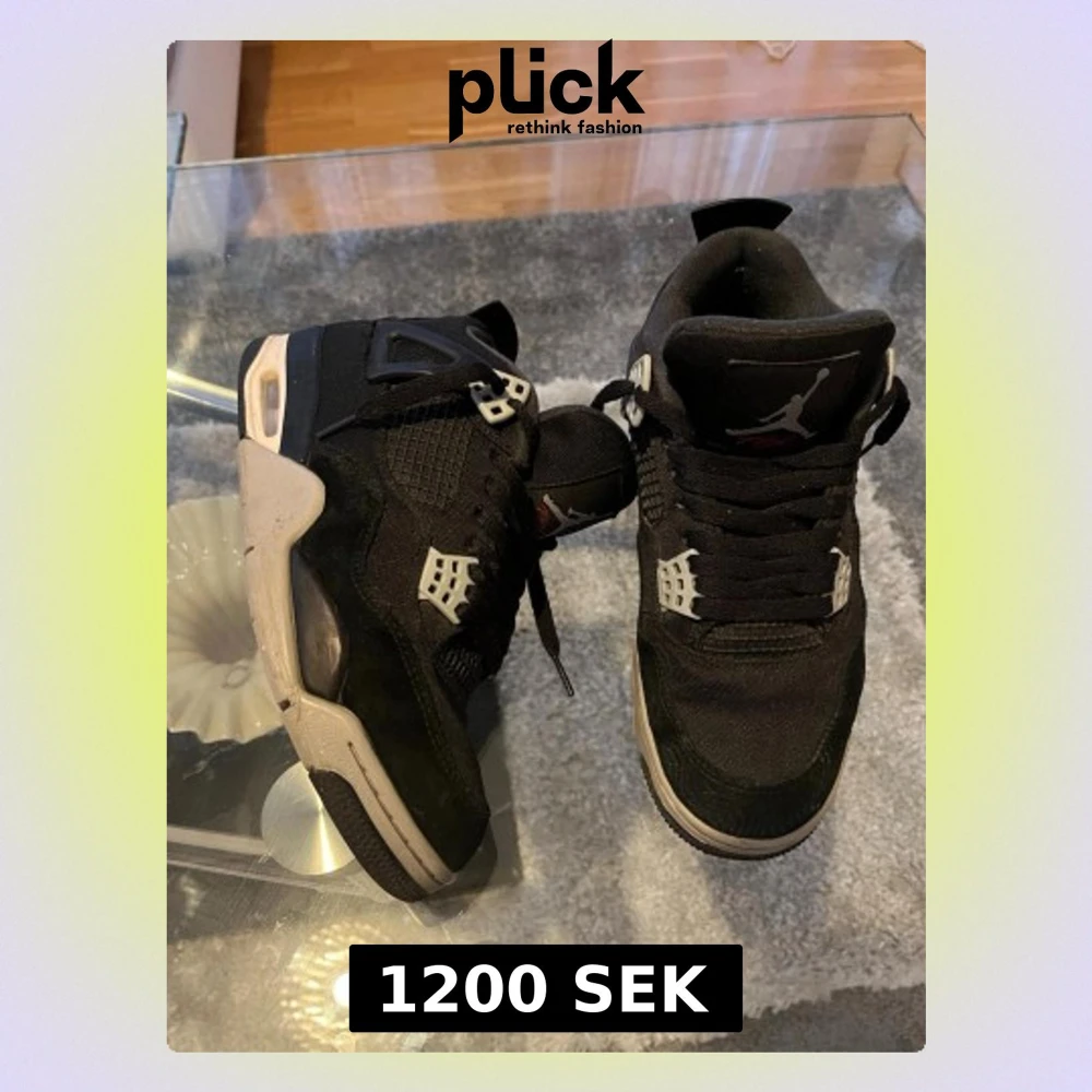 Säljer ett par svarta Nike Air Jordan 4 sneakers med meshpaneler, mockadetaljer och vita plastdetaljer vid snörningen. Skorna har en ikonisk Jumpman-logga på plösen och en tjock, vit sula med synlig luftdämpning. Perfekta för dig som vill ha en klassisk och stilren sneaker.