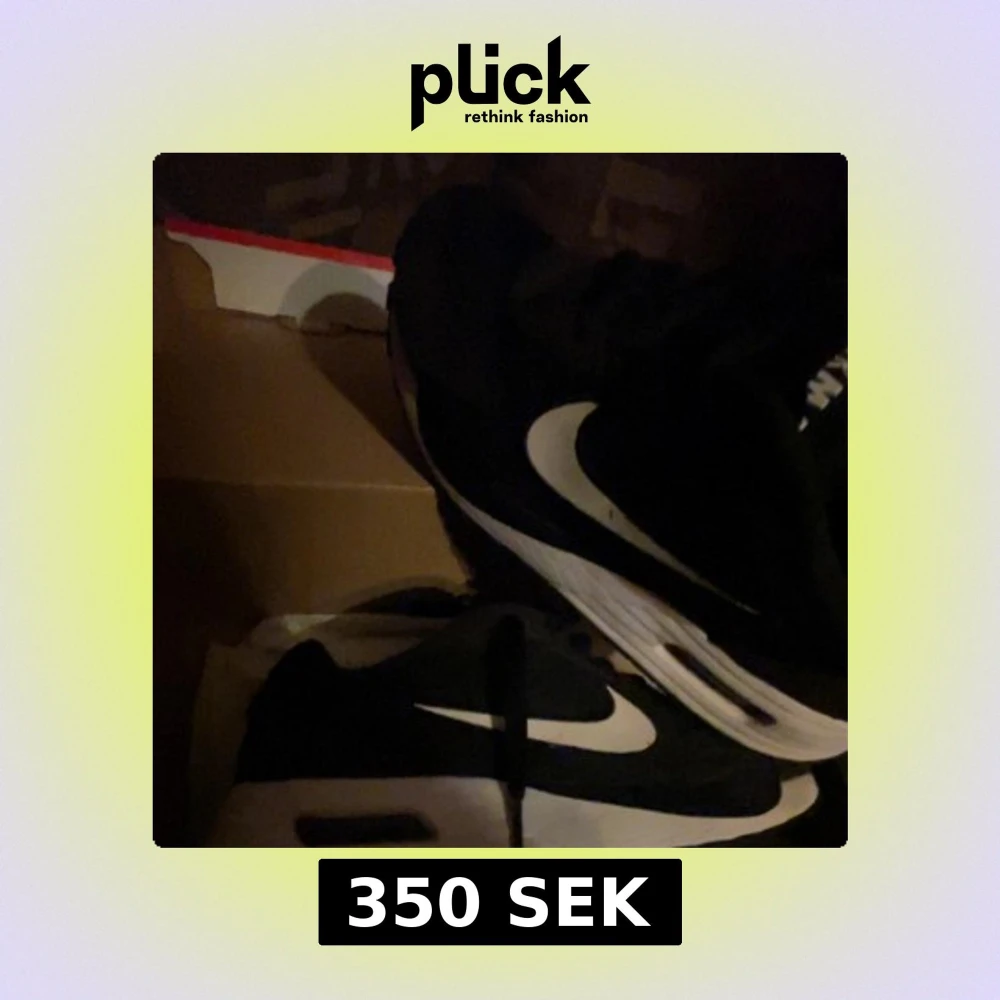 Säljer ett par klassiska Nike Air Max i svart och vitt. Skorna har den ikoniska Air Max-sulan och en tydlig Nike-logga på sidan. Perfekta för både stil och komfort. 350 för dom