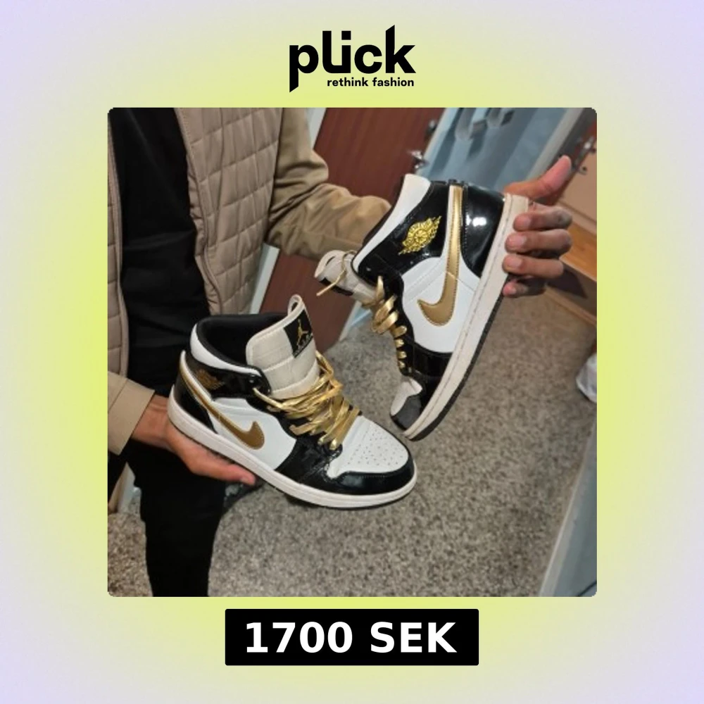 Säljer ett par Nike Air Jordan 1 med svart, vit och guld färg. Skorna har glänsande svarta paneler, vita partier och metallicguld Swoosh samt logga. Guldiga skosnören och klassisk hög siluett. Perfekta för dig som vill sticka ut med en ikonisk sneaker.