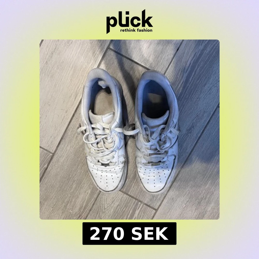Säljer ett par klassiska vita Nike Air Force 1 sneakers med snörning och rund tå. Skorna har en platt sula och är tillverkade i skinn med diskreta sömdetaljer och Nike-logga på sidorna. Perfekta för dig som gillar en clean och tidlös stil.