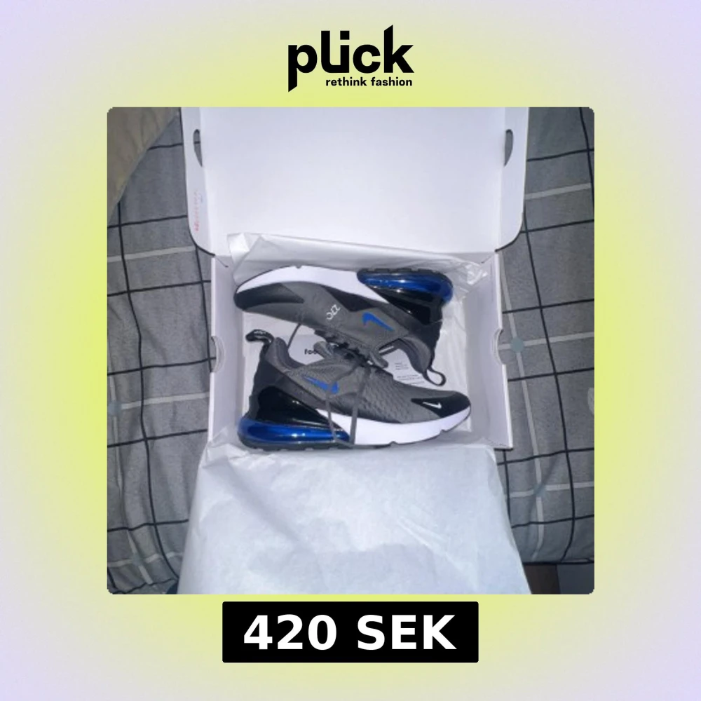 Nike Air Max 270 sneakers i grått med svarta och blå detaljer. Skorna har en stor blå Air Max-sula, mesh-ovandel och klassisk snörning. Perfekta för dig som gillar sportig stil och vill ha bekväma sneakers med modern design.