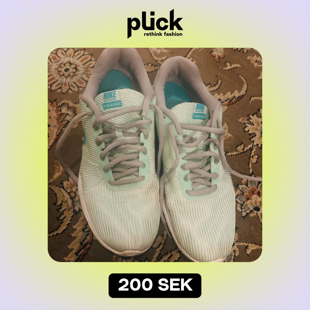Säljer ett par Nike Flex Run 2016 sneakers i en fräsch mintgrön färg med turkosa detaljer. Skorna har en bekväm passform och är perfekta för träning eller vardagsbruk. De är i bra skick med lite slitage på tån. Snörning framtill och en lättviktig design gör dem superbekväma att ha på sig.