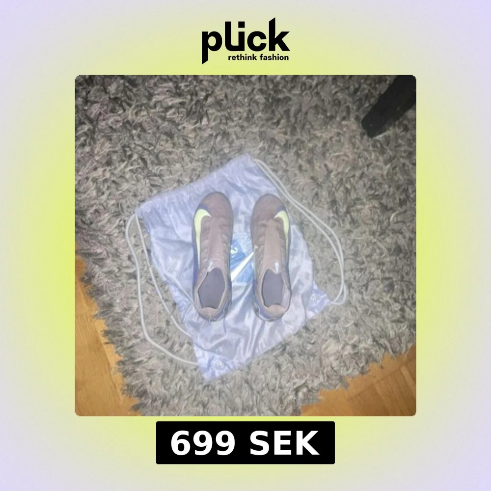 Säljer ett par Nike fotbollsskor i beige med blå och ljusgula detaljer. Skorna har en rund tå och platt sula med dobbar för bra grepp på planen. Snygg design med stora Nike-loggor på sidorna och mönstrad ovandel i syntetmaterial. Perfekt för dig som vill sticka ut på matchen.