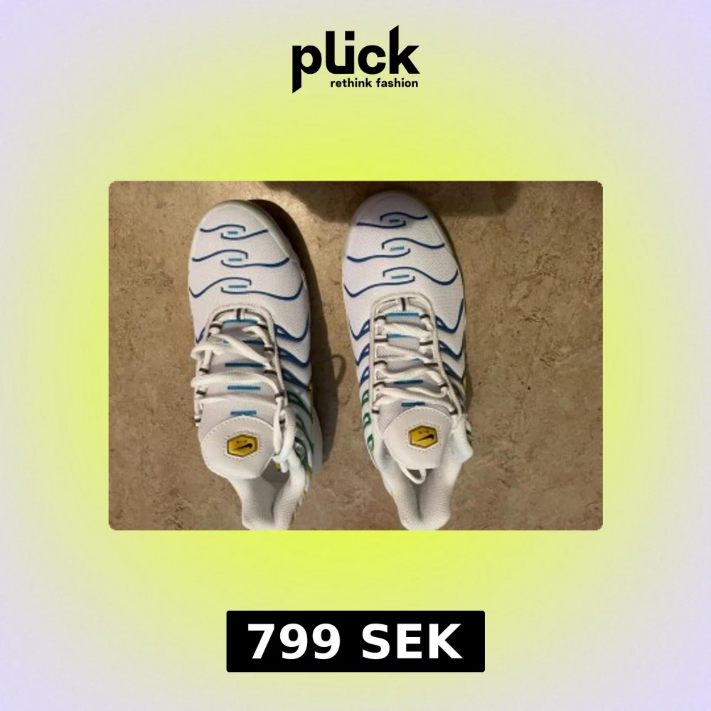 Nike Air Max Plus sneakers i vitt mesh med blå, gröna och gula vågiga detaljer. Snygg gradient på sidorna och klassisk Air Max-sula med synliga luftkuddar. Svarta och vita snören, rund tå och platt sula. Perfekt för dig som gillar färg och streetstyle.