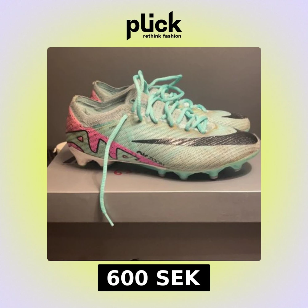 Snygga Nike fotbollsskor i mintgrön med rosa och svarta detaljer. Skorna har snörning och en modern design med tydliga logotyper på sidorna. Perfekta för fotbollsplanen med en stilren look.