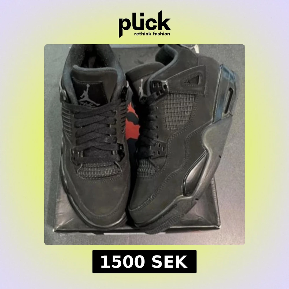 Säljer ett par svarta Nike Air Jordan 4 Retro Black Cat sneakers. Skorna har en helsvart design med meshpaneler, mockadetaljer och klassisk Jumpman-logga på plösen. De har snörning och en chunky sula som ger en riktigt clean och stilren vibe.