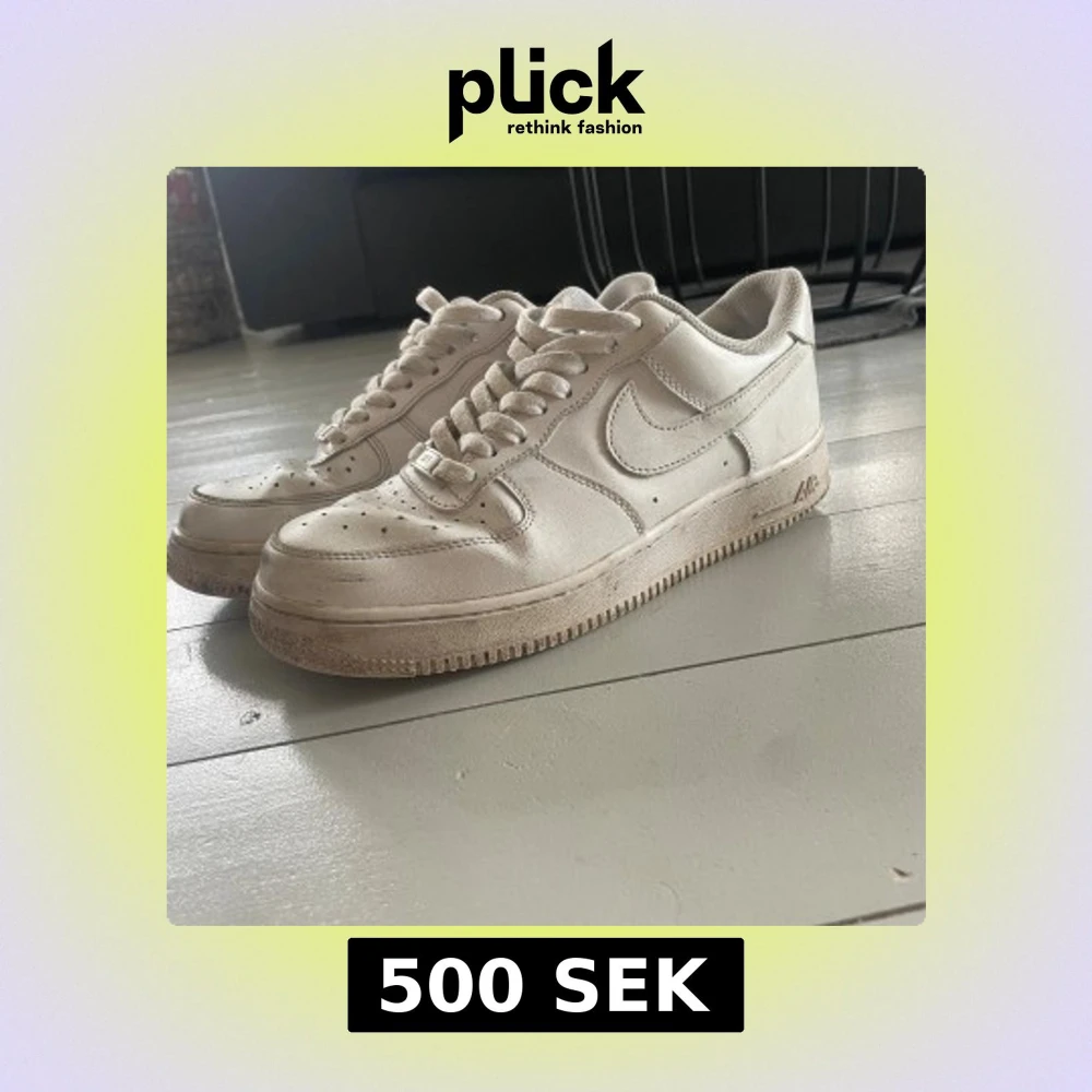Klassiska Nike Air Force 1 sneakers i helvitt skinn med rund tå och platt sula. Modellen har snörning och perforerade detaljer på tån för extra ventilation. Swoosh-loggan syns tydligt på sidorna och sulan har det ikoniska cirkelmönstret. Perfekt för dig som gillar streetstyle.