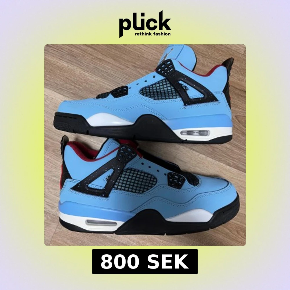 Säljer ett par Nike Air Jordan 4 Travis Scott Cactus Jack i ljusblå mocka med svarta och röda detaljer. Skorna har nätpaneler, svart och vit sula med röd Jumpman-logga och broderad Cactus Jack-text på hälen. Riktigt snygga sneakers med ikonisk design och coola detaljer. De är inte använda alls ! Helt nya