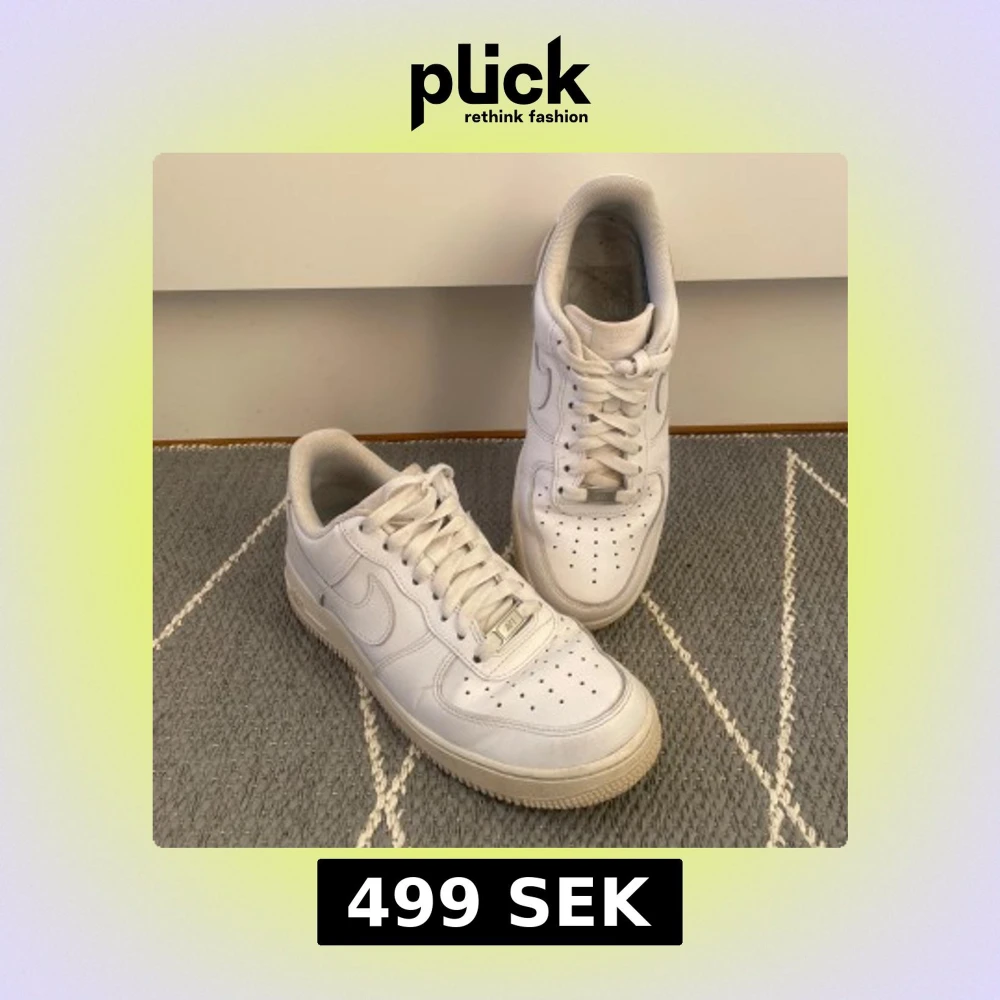 Säljer ett par klassiska vita Nike Air Force 1 sneakers. Skorna har en stilren design med snörning och perforerade detaljer på ovansidan för bättre ventilation. Perfekta för en avslappnad och trendig look. • Skorna är välanvända, men i gott skick utan några hål eller separationer. Motsvarar bilderna väl.