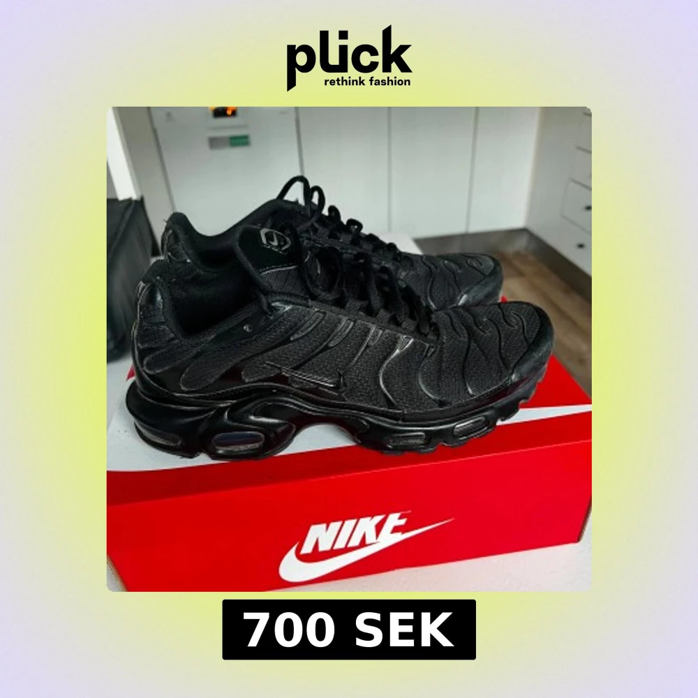 Säljer ett par helsvarta Nike Air Max Plus sneakers med ikonisk vågig design och synliga Air-enheter i sulan. Ovandelen är i mesh och syntet med snygga detaljer och klassisk Nike-logga på tungan. Grymma skor för dig som gillar streetstyle och komfort.