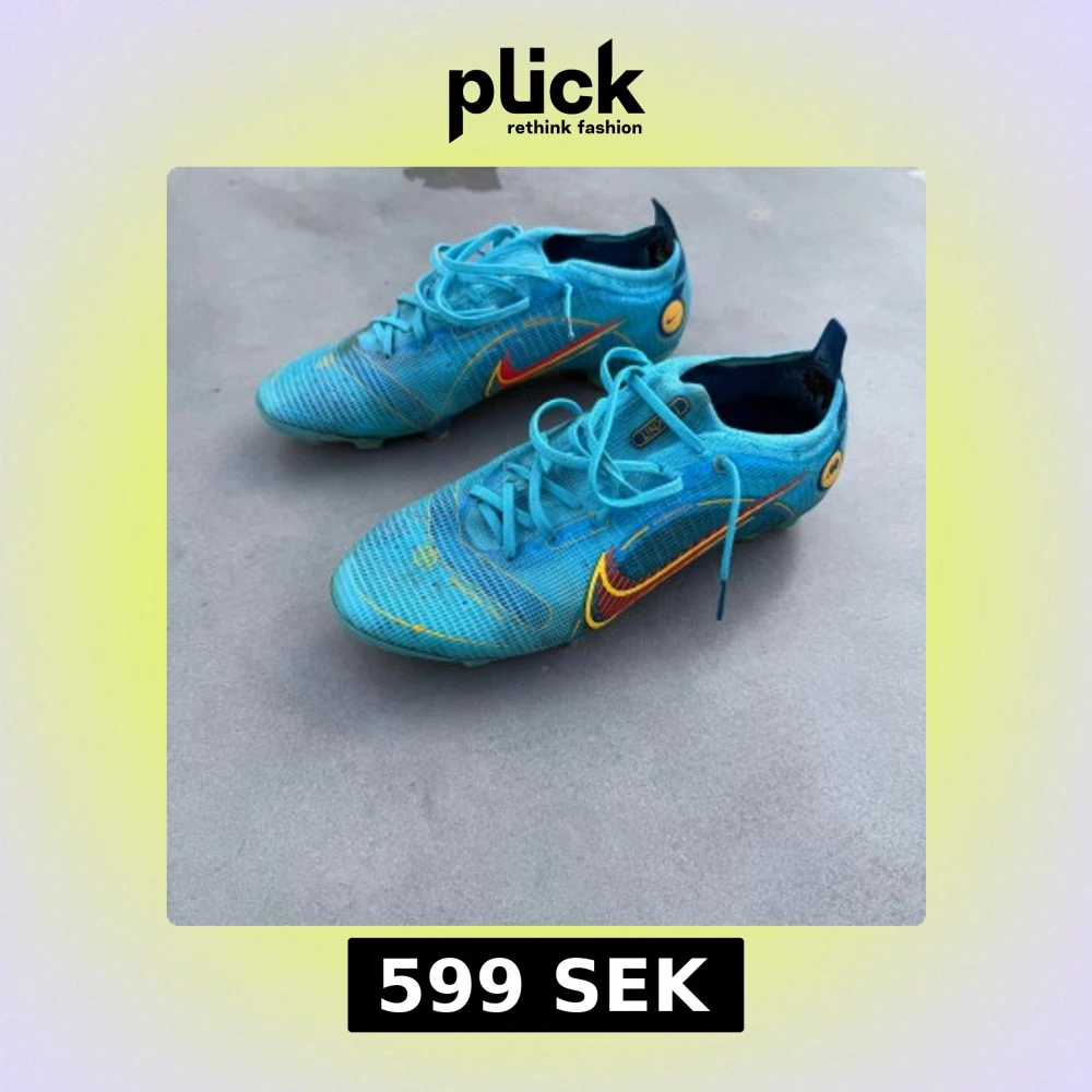 Blå Nike fotbollsskor med snörning - Säljer ett par blå Nike fotbollsskor med gula detaljer och snörning. Skorna har en smidig och sportig design med högre skaft och är tillverkade i syntetmaterial för bästa grepp och känsla på planen. Perfekta för dig som vill sticka ut på matchen!