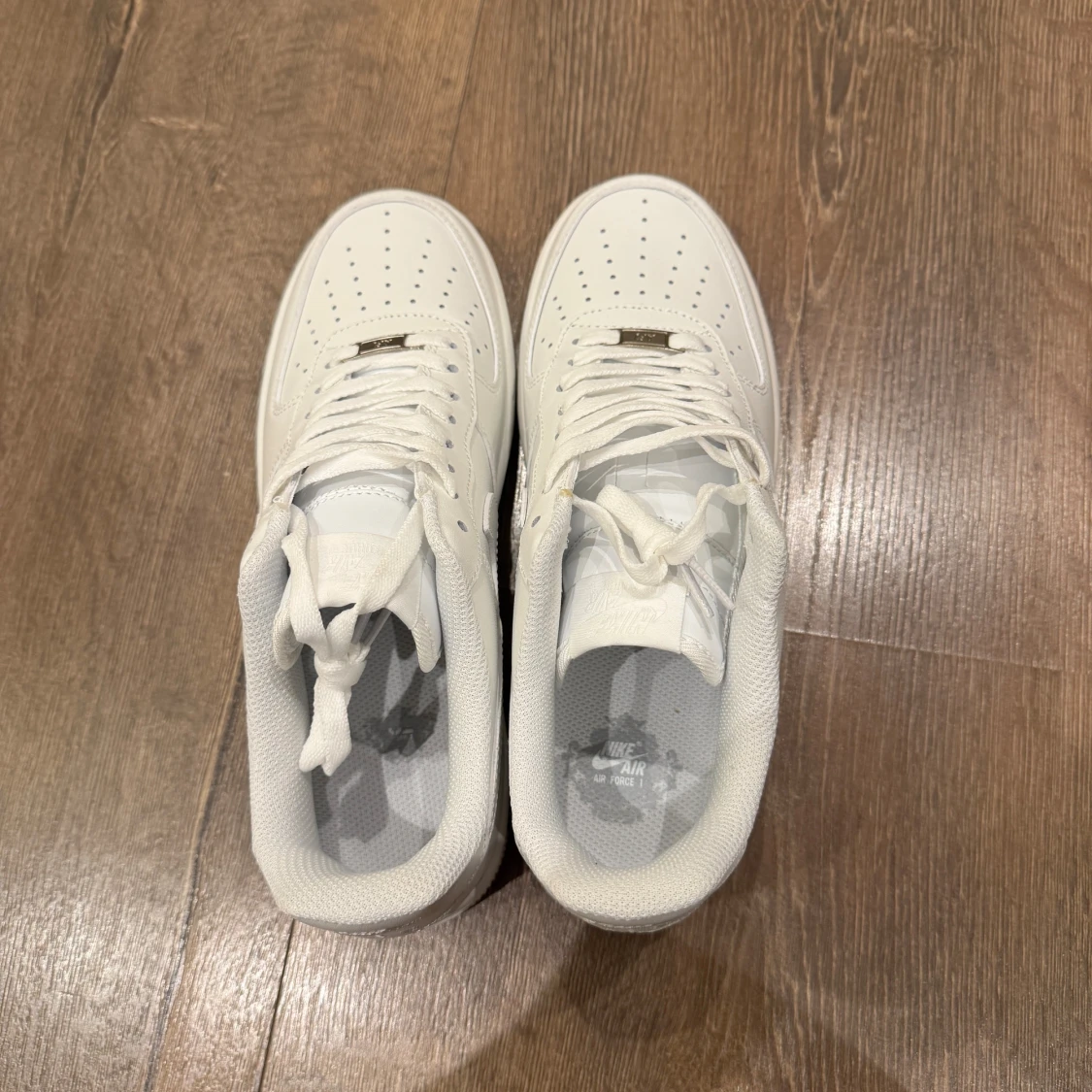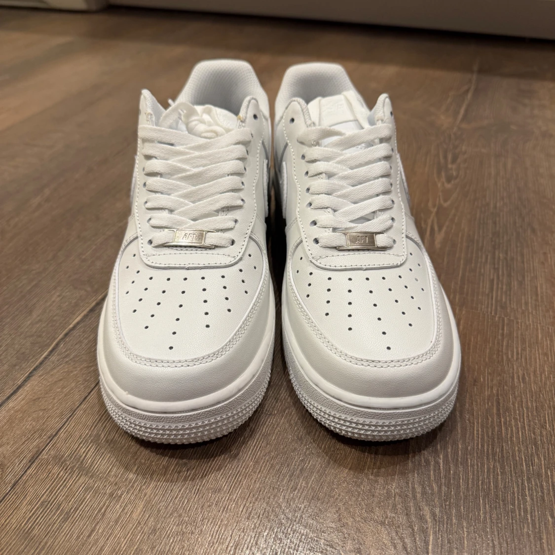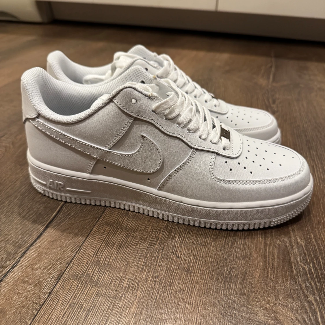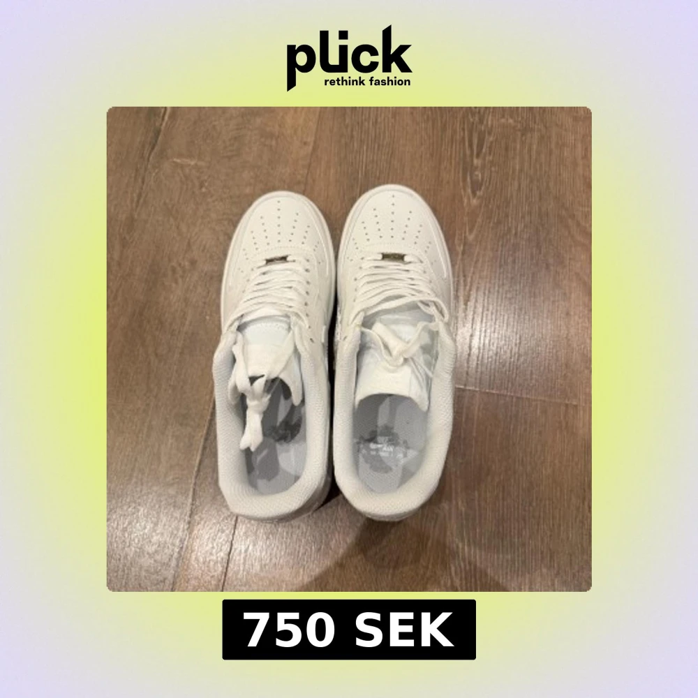 Klassiska Nike Air Force 1 sneakers i helvitt skinn med perforerad tå, rund tå och platt sula. Snygg och tidlös modell med snörning och diskret Nike-logga på sidan. Perfekta för dig som vill ha en clean och stilren look.