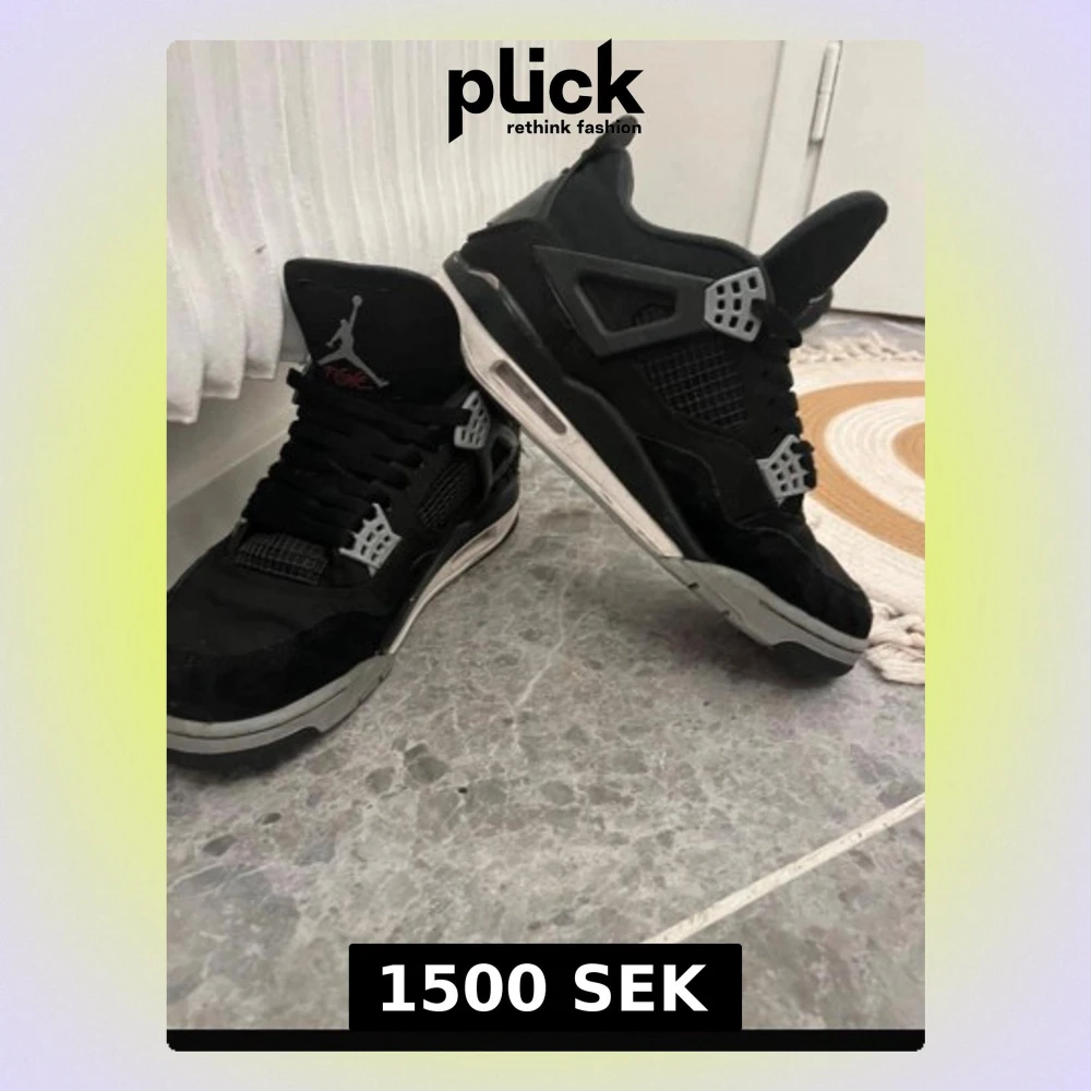 Säljer ett par svarta Nike Jordan 4 sneakers med grå och vita detaljer. Skorna har snörning, meshpaneler och en platt sula. Ikonisk Jumpman-logga på plösen och cool design som sticker ut.