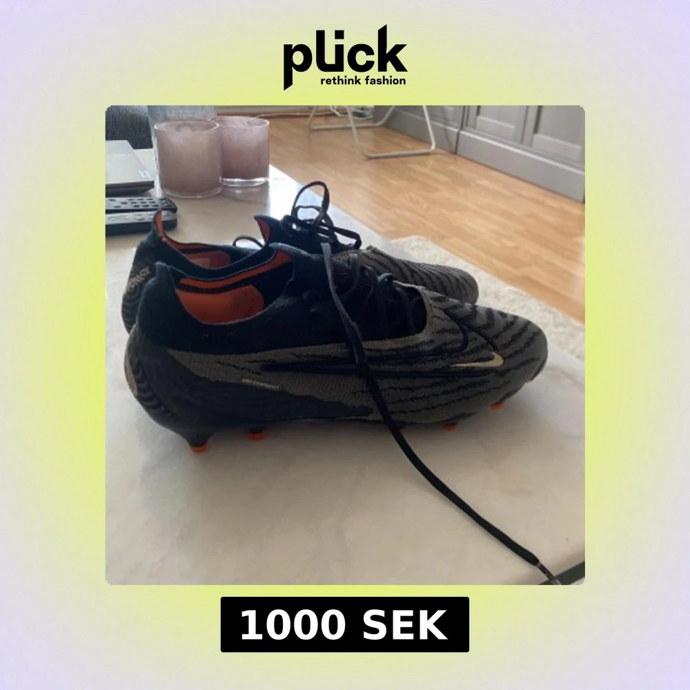 Säljer ett par Nike Phantom GX fotbollsskor i svart och grå med orange detaljer. Skorna har snörning och mönstrad ovandel för extra grepp på planen. Perfekta för dig som vill ha stilrena och funktionella fotbollsskor.