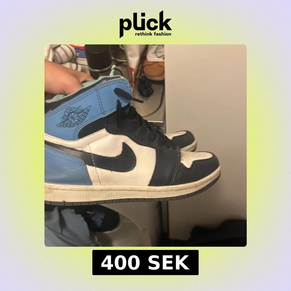 Säljer ett par Nike Air Jordan 1 High med snygg färgblockning i ljusblått, marinblått och vitt. Skorna har klassisk snörning, rund tå och ikoniska Jordan Wings-loggan på sidan. Ovandelen är i skinn och sulan är vit med svart yttersula. Perfekta för dig som gillar streetwear.