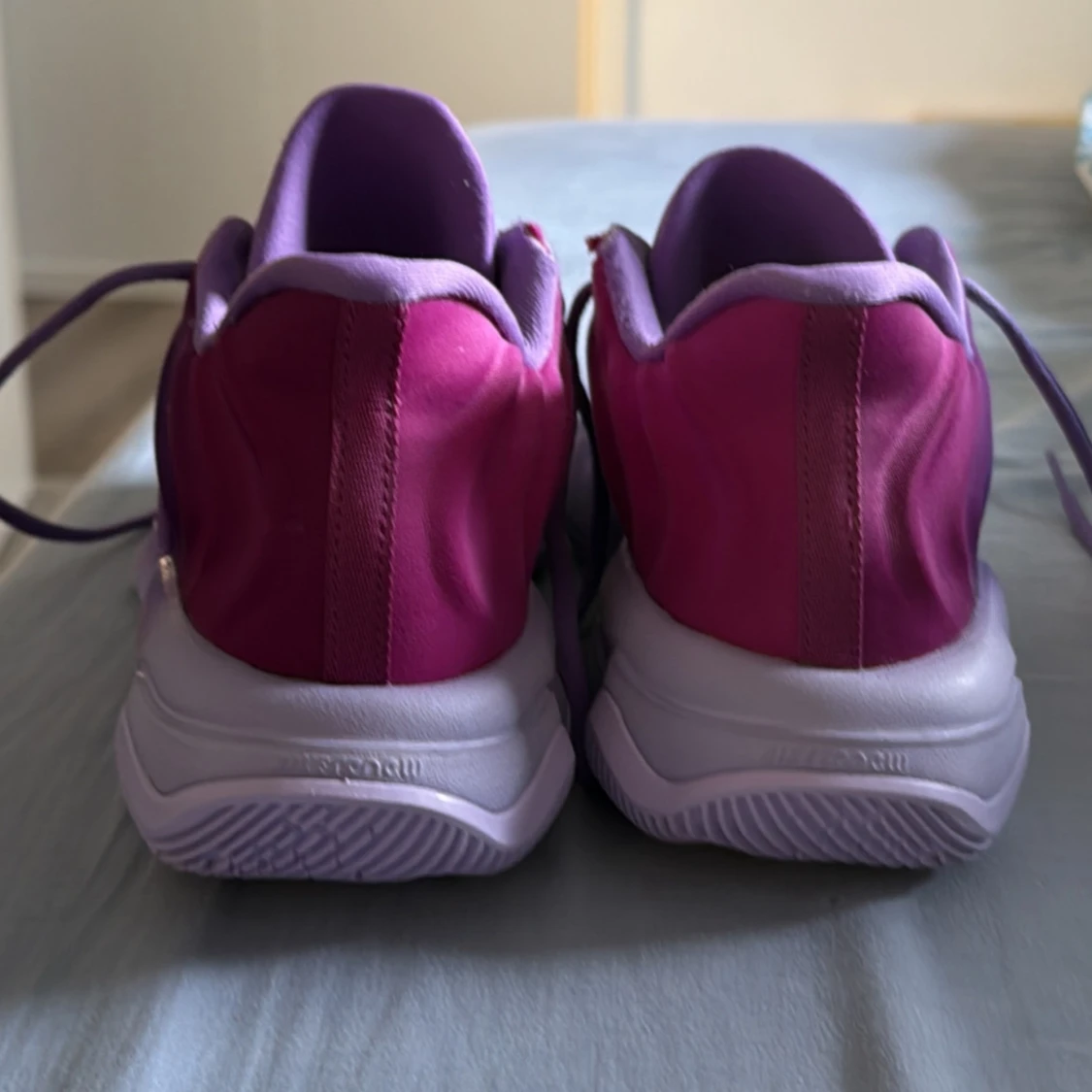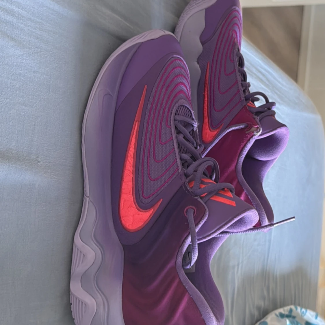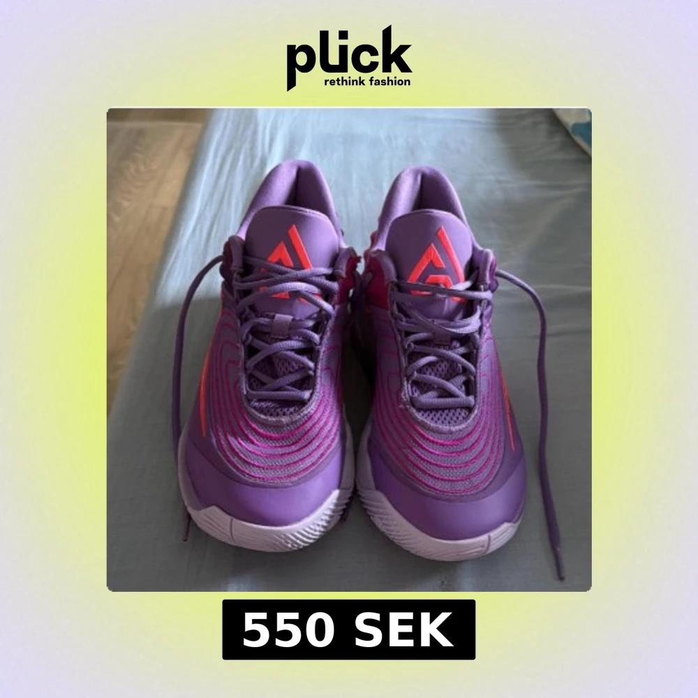 Säljer ett par snygga lila och rosa Nike sneakers med neonrosa detaljer och logga. Skorna har snörning och en platt sula, perfekt för dig som gillar färgstarka träningsskor. Ikonisk Nike Swoosh på sidan och bekväm passform.