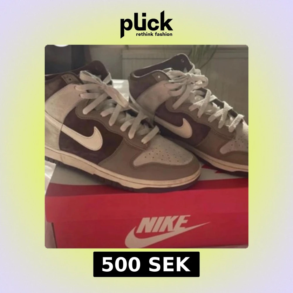Nike Dunk High sneakers i en snygg mix av beige och brunt mocka med vita detaljer och snörning. Skorna har en klassisk hög siluett och vit swoosh på sidan. Perfekta för dig som gillar streetwear och vill ha något stilrent men ändå unikt.