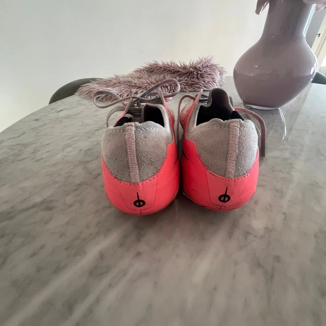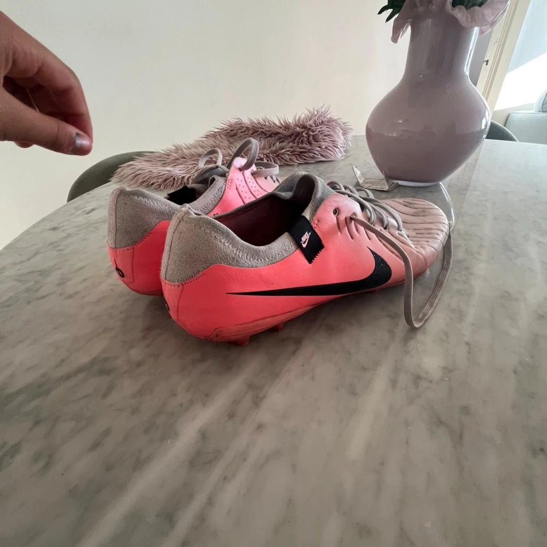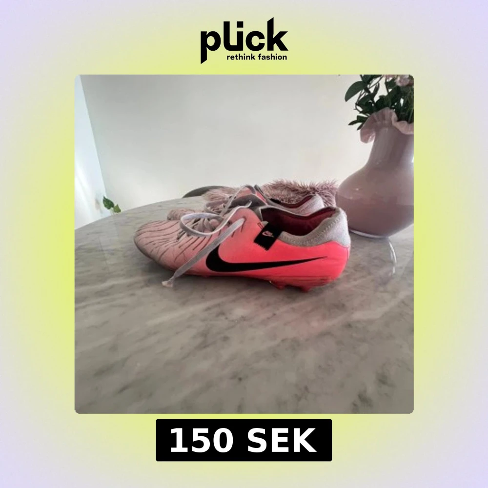 Säljer ett par snygga Nike fotbollsskor i rosa och grått med svart swoosh på sidan. Skorna har snörning och är designade för att ge bra grepp på planen. Ovandelen är i syntetmaterial och hälen är klädd i grått tyg. Perfekta för dig som vill sticka ut på matchen!
