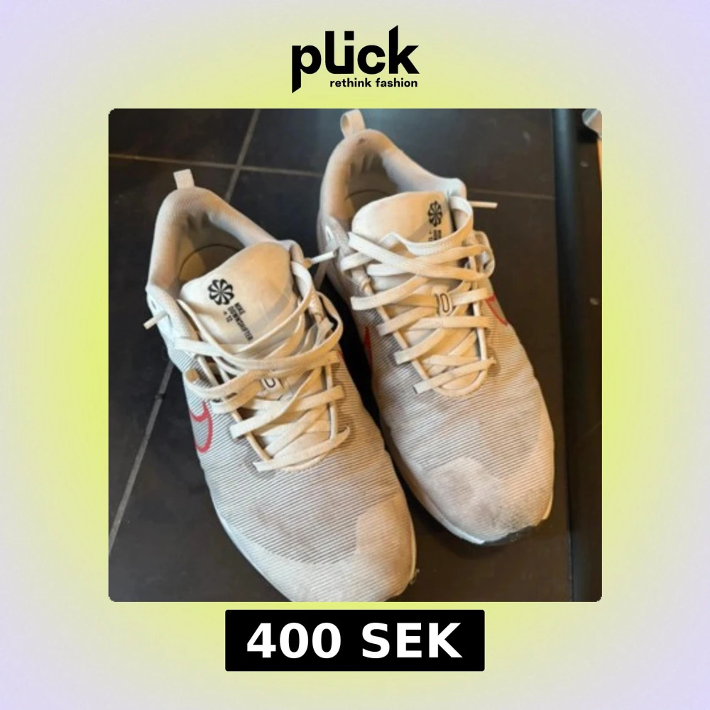 Säljer ett par vita Nike sneakers med röd swoosh på sidan. Skorna har snörning och en platt sula, samt diskreta ränder i materialet. Perfekta för träning eller vardagsstil. Klassisk design med bekväm passform.