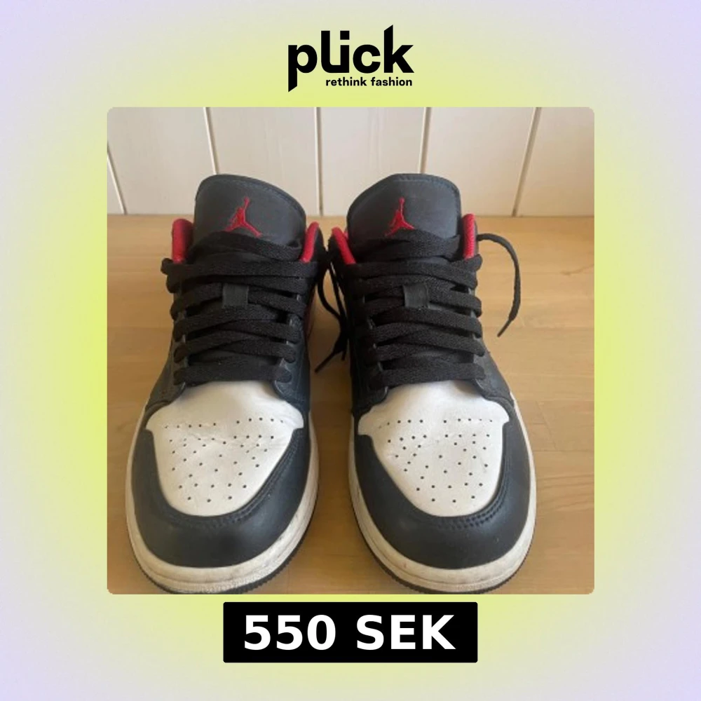 Säljer ett par Nike Air Jordan 1 Low med svart ovandel, röda detaljer och vit tå, skorna är inte använda särskilt mycket men dock lite creasade, därför är priset lite lägre. Bara att skriva om du fungerar på något.