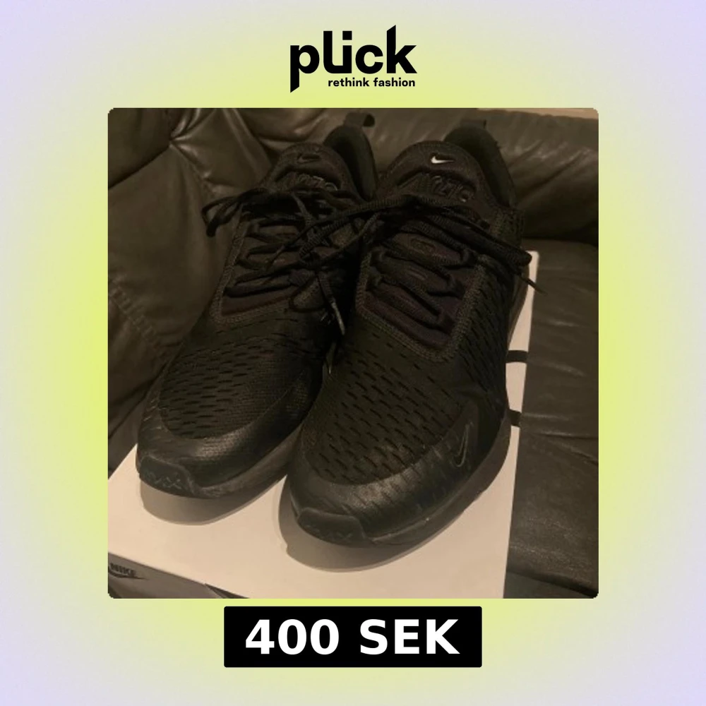 Nike Air Max 270 sneakers i helsvart färg med mesh-överdel och synlig Air-enhet i hälen. Skorna har snörning, rund tå och platt sula. Snygg och sportig design med diskreta Nike-loggor på sidan och tungan. Perfekt för dig som gillar streetwear och komfort. Ena sulan e lite lös och behöver limmas väldigt lätt. Priset kan diskuteras vid snabb affär