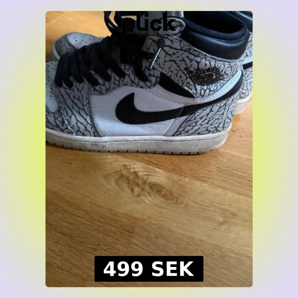 Säljer ett par Nike Air Jordan 1 sneakers med högt skaft. Skorna har ett unikt grått och svart mönster som påminner om elefantmönster, svart swoosh och svarta snören. Materialet är skinn och syntet, och färgerna är främst grå, svart och vit.
