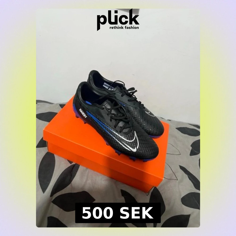 Säljer ett par svarta Nike fotbollsskor med blå och silverdetaljer. Skorna har snörning, rund tå och är tillverkade i syntetmaterial. Snygg design med Nike-logga på sidan och blå sula med dobbar för bra grepp på planen. Perfekta för dig som vill sticka ut på matchen!