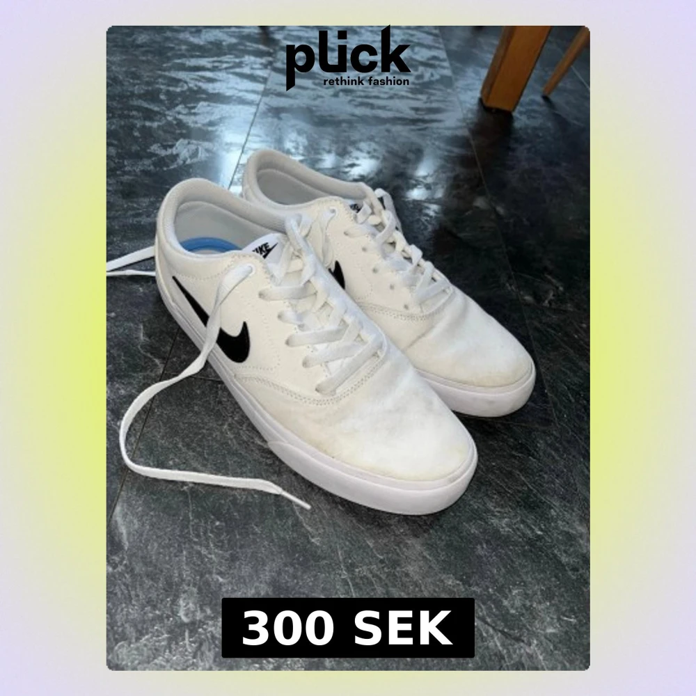 Säljer ett par klassiska vita Nike sneakers med svart swoosh på sidan. Skorna har snörning, rund tå och platt sula. Ovandelen är i textil och insidan har en blå innersula med Solesole-logga. Perfekta till vardagslooken! Använda endast ett fåtal gånger pga för liten storlek.