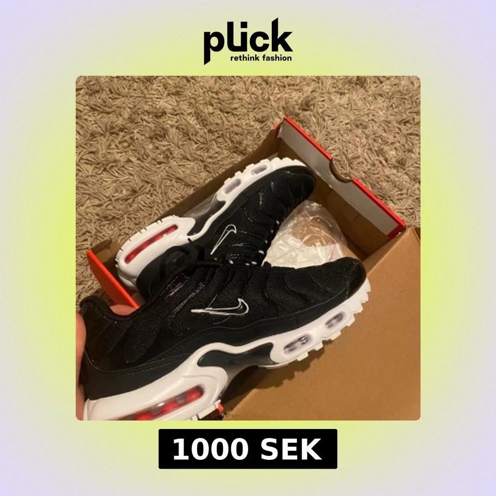 Lätt använda. Svarta Nike Air Max Plus sneakers med vit sula och röda detaljer i sulan. Skorna har tydliga luftbubblor, vit swoosh-logga på sidan och klassisk platt sula. Perfekta för dig som gillar sportig och modern stil.