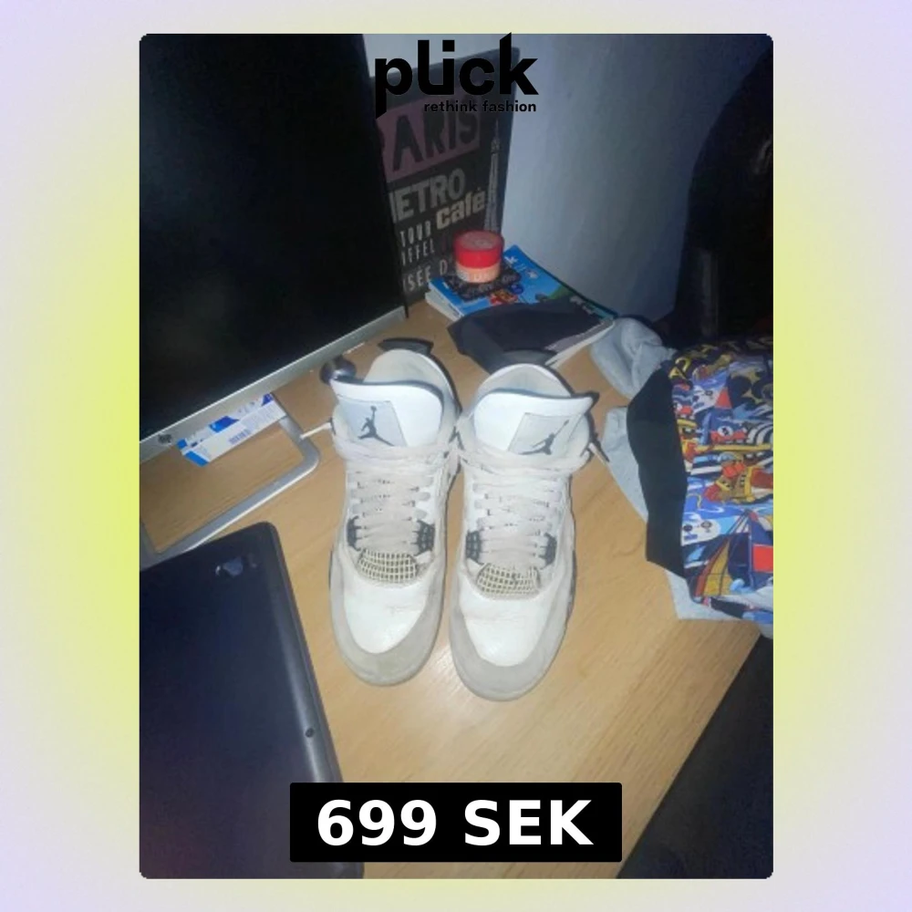 Säljer ett par Nike Air Jordan 4 Retro i vitt och svart med klassisk Jumpman-logga på plösen och hälen. Skorna har meshpaneler, snörning och detaljer i svart och grått. Ovandelen är i skinn och mesh för en ikonisk look. Perfekta för dig som vill sticka ut med en tidlös sneaker. Ser lite smutsiga ut men ska tvätta dem så dem ser helt nya ut