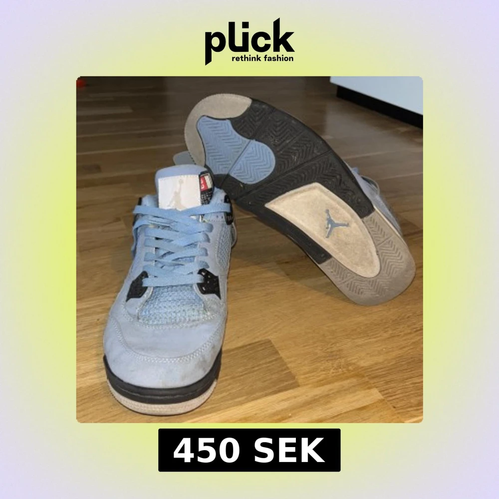 Säljer ett par Nike Air Jordan 4 University Blue sneakers i ljusblå mocka med svarta och grå detaljer. Skorna har klassisk snörning, meshpaneler och den ikoniska Jumpman-loggan på tungan och sulan. Perfekta för dig som vill sticka ut med stilrena och sportiga sneakers. Skorna behöver dock tvättas