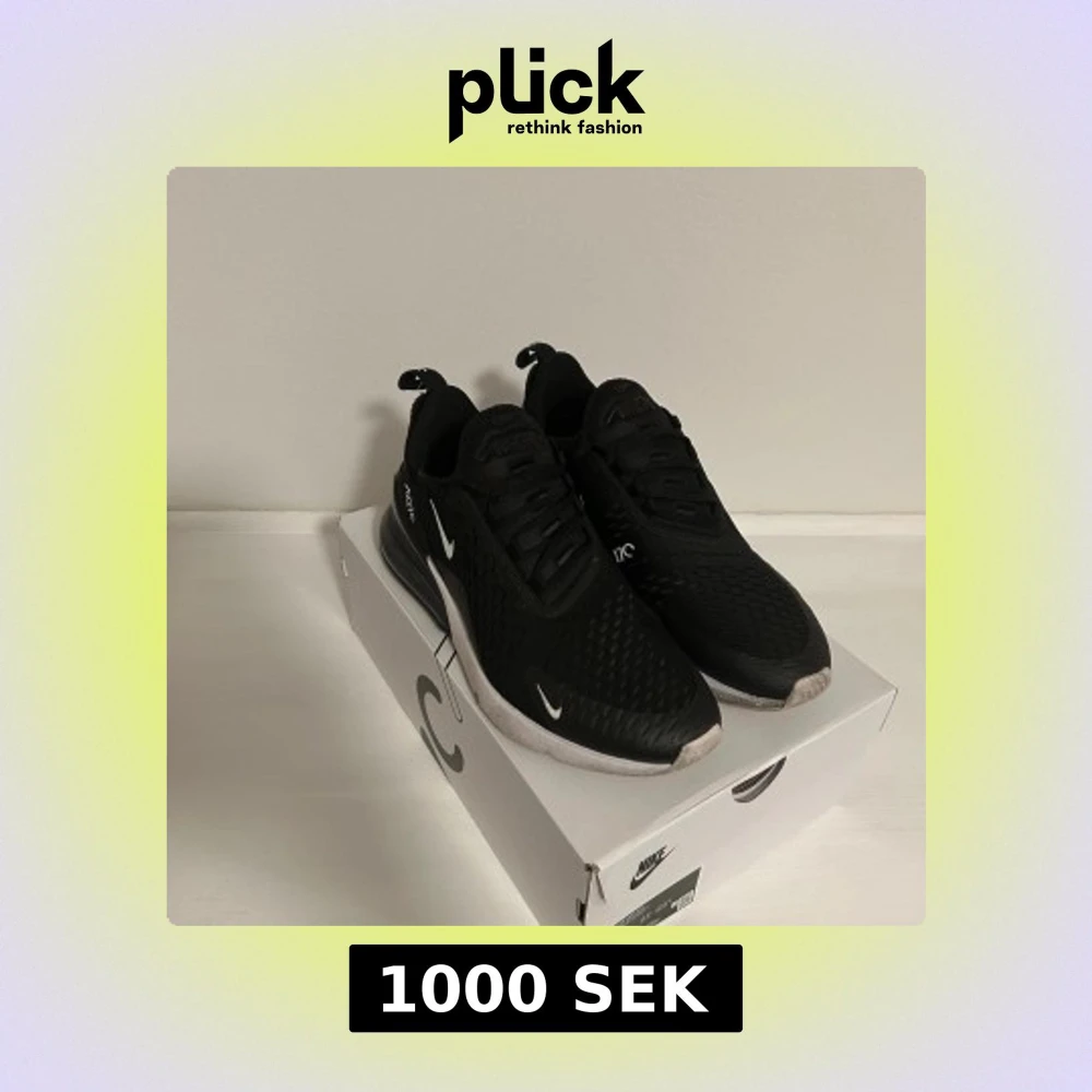 Svarta Nike Air Max 270 sneakers med vit sula och diskreta vita logodetaljer. Skorna har en mesh-överdel för bra ventilation, snörning och en synlig Air-enhet i hälen för extra komfort. Perfekta för dig som gillar sportig stil och vill ha något som sticker ut.