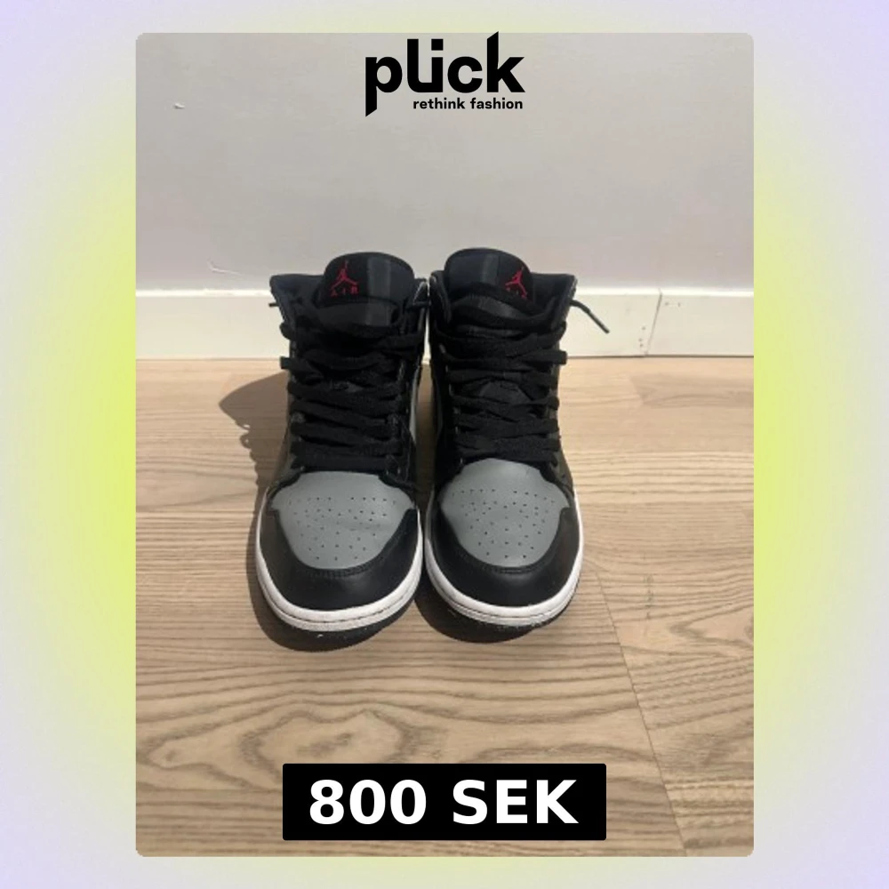Säljer ett par Nike Air Jordan 1 Mid sneakers i svart och grått med röda detaljer på tungan. Skorna har klassisk snörning, rund tå och platt sula. Materialet är skinn och syntet, med den ikoniska swoosh-loggan på sidan och Air Jordan-vingen på ankeln.