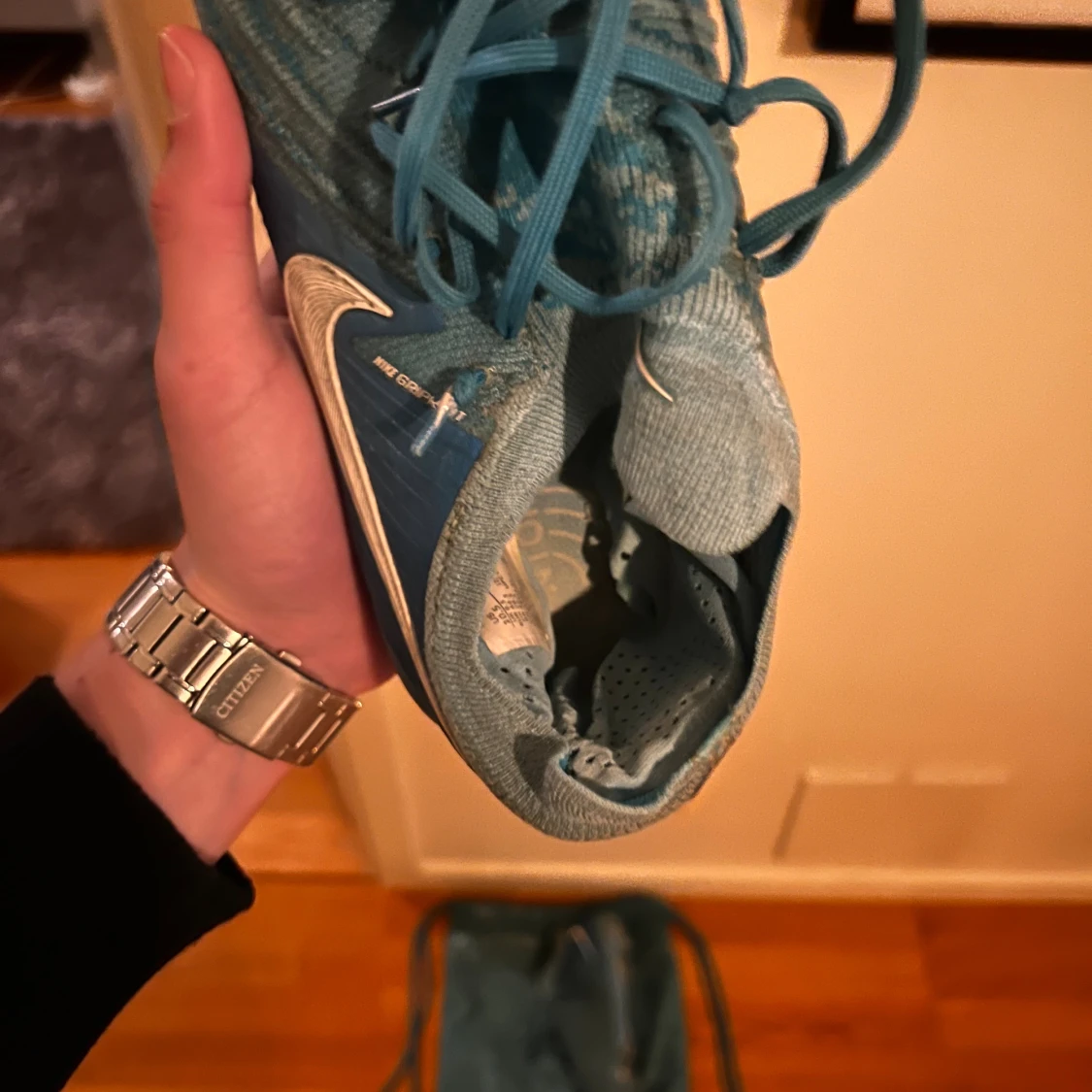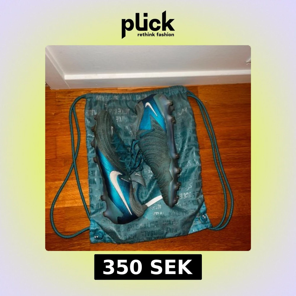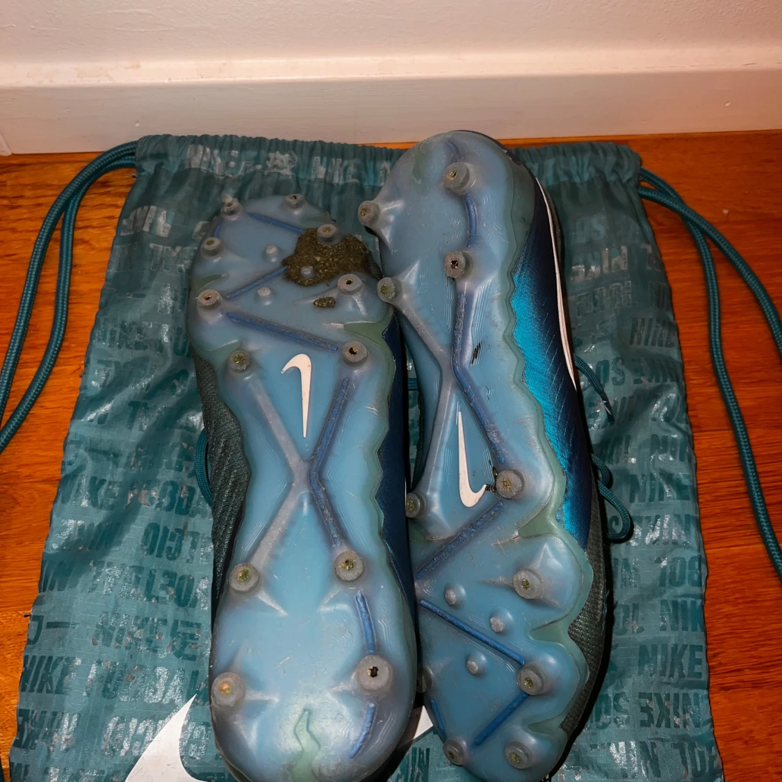 Säljer ett par blå Nike fotbollsskor med vit swoosh och snörning. Skorna har en stickad ovandel och plös, samt dobbar för spel på gräs. Snygg sportig design och kommer med tillhörande Nike-påse. Perfekta för dig som vill sticka ut på planen.