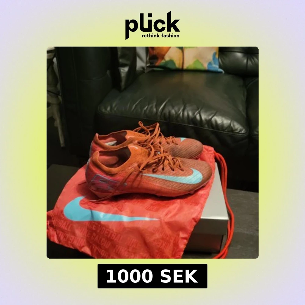 Säljer ett par Nike Mercurial fotbollsskor i en snygg röd färg med ljusblå detaljer och logga. Skorna har snörning, platt sula med dobbar och är tillverkade i syntetmaterial för bästa grepp på planen. Perfekt för dig som vill sticka ut med stil på fotbollen. Säljer pga köpt nya, inga fler bud allt blir bara för lågt.