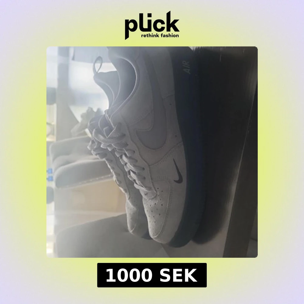 Säljer ett par Nike Air Force 1 sneakers i grå mocka med svart sula. Klassisk siluett med rund tå, snörning och diskret Nike-logga på sidan och hälen. Perfekta för dig som gillar stilrena och tidlösa sneakers med en twist av mocka.