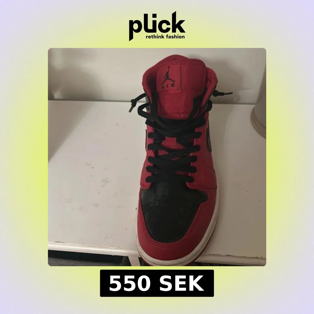 Säljer ett par klassiska Nike Air Jordan 1 Mid i rött och svart med vita sulor. Skorna har svart snörning, svart swoosh och hög modell. Perfekta för dig som gillar streetwear och vill sticka ut med en ikonisk sneaker.